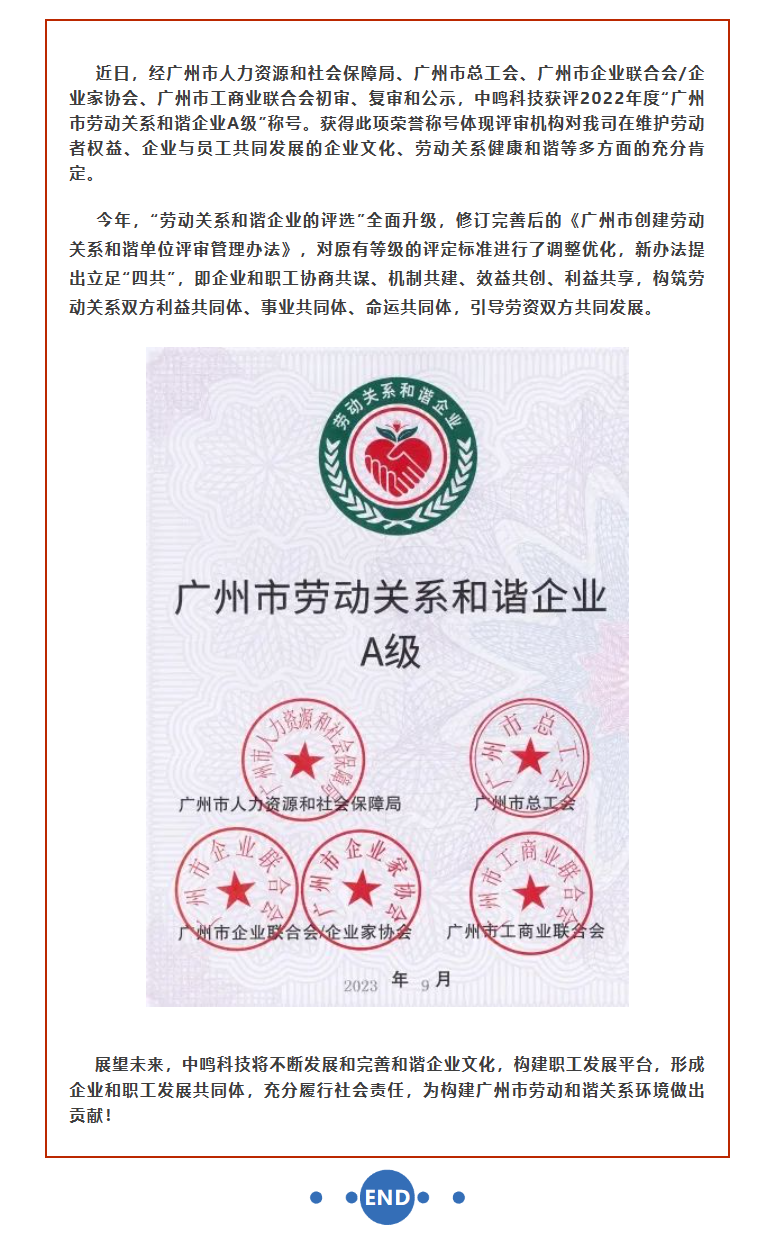 中鳴科技榮獲“廣州市勞動關系和諧企業”稱號