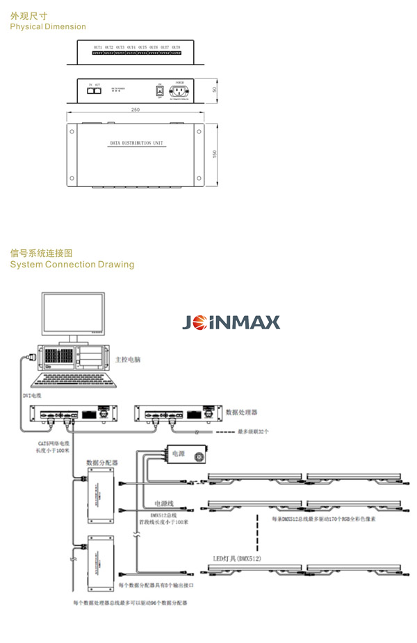 ? DDU converts the signal from the Data Processor into standard DMX512 data for lighting fixtures in the lighting system on a large scale. Each DDU can drive 1360, 170 x 8, full colour LED display units (lighting fixtures or pixels). Features of the DMX512 DDU are as follows: