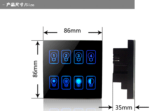1、Powered by DALI bus, and equipped with 8 backlight (blue or yellow) touch-type input buttons.